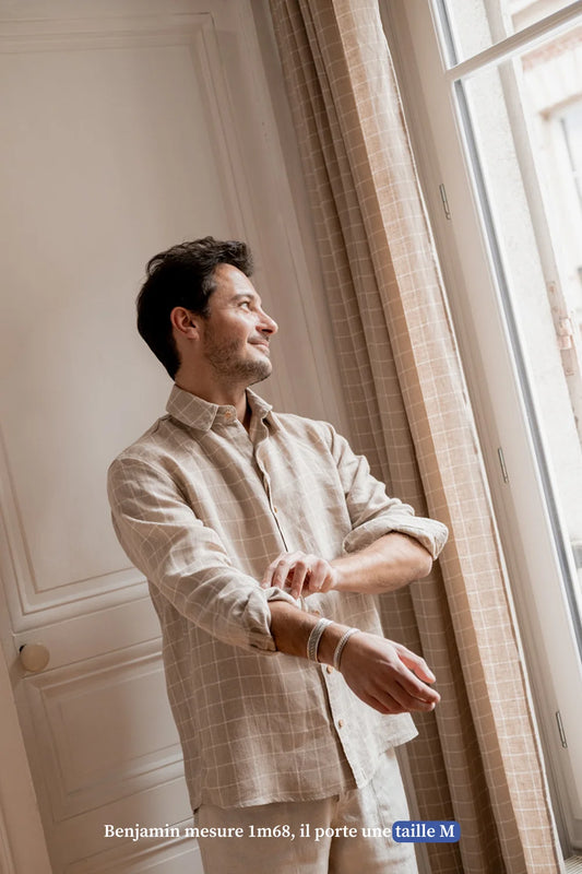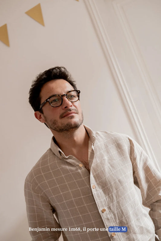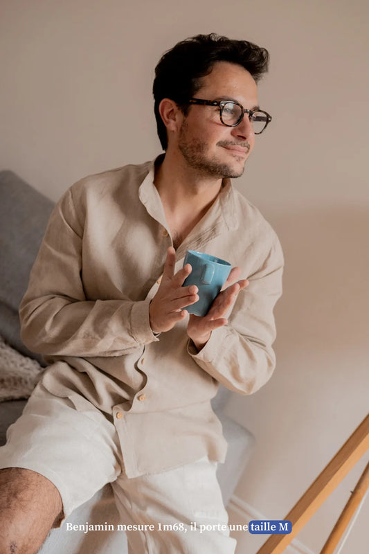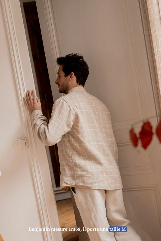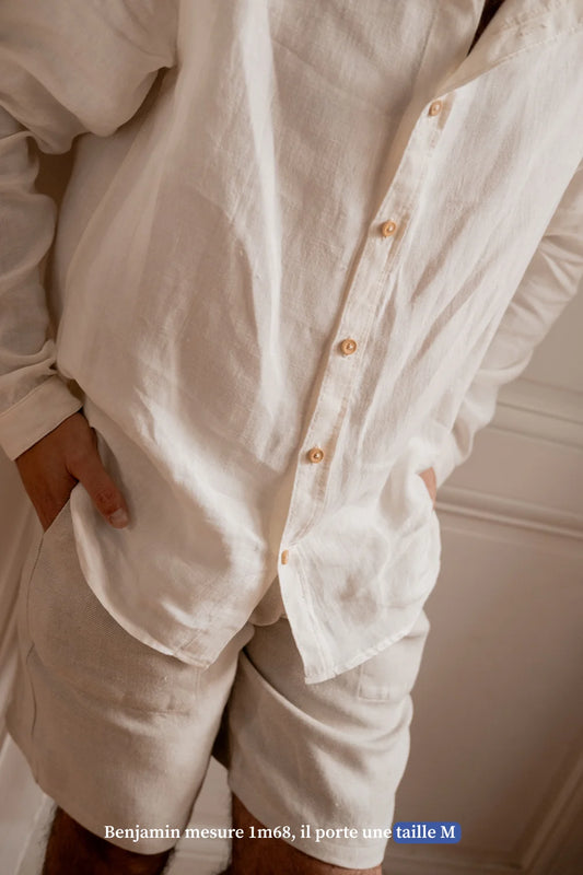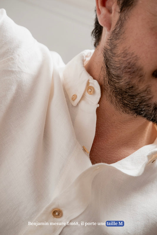 La chemise 100% lin a été conçue avec un tissu léger et imaginé pour qu’elle soit robuste et légère : un col de 2,5 cm de large qui se tient, des manchettes renforcées, des plis d'aisances dans le dos pour être libre de ses mouvements et puis évidemment des jolis boutons en buis du Jura en version mini. La chemise en lin Mijuin existe avec 3 cols différents : la col mao, la col boutonné, la col classique.