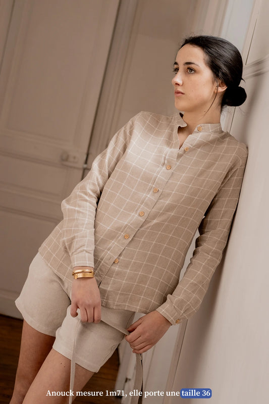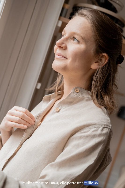 Pour cette tunique, on repart sur notre col préféré -le col mao - accompagné de trois boutons discret en buis du jura. Disponible également en beige ou en blanc, cette tunique s’associe facilement avec vos pantalons favoris.