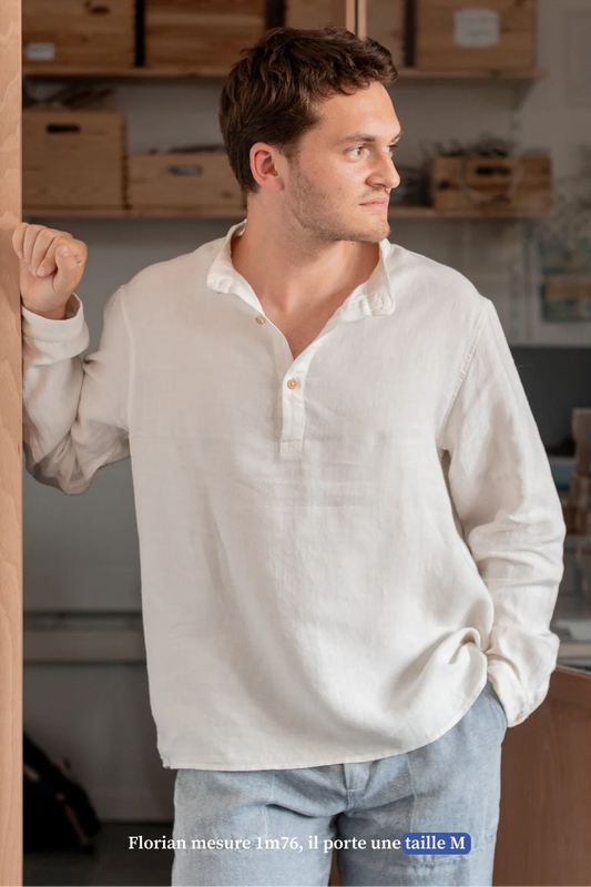La chemise 100% lin a été conçue avec un tissu léger et imaginé pour qu’elle soit robuste et légère : un col de 2,5 cm de large qui se tient, des manchettes renforcées, des plis d'aisances dans le dos pour être libre de ses mouvements et puis évidemment des jolis boutons en buis du Jura en version mini. Notre chemise en lin est disponible en plusieurs versions : la col mao, la col classique et la col boutonné.