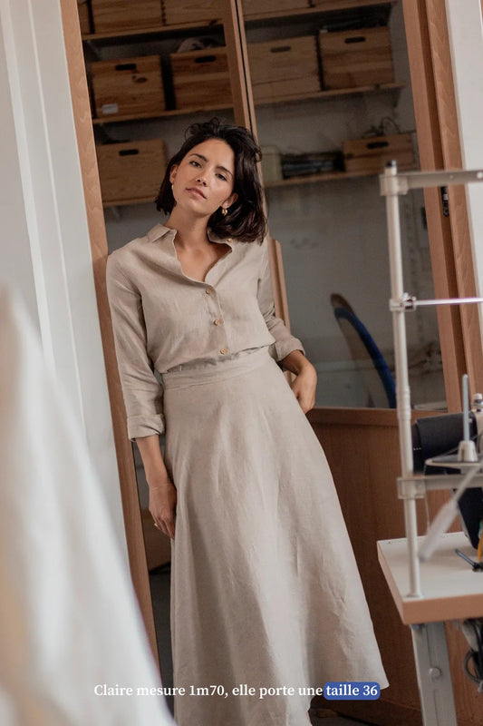 Chez Mijuin, nous confectionnons des vestes de travail, chemises, vestes sans manche, pantalons, shorts, jupes et robes en 100% lin circuit court. Ces vêtements en lin pour femme ont été imaginés pour être robustes, pratiques et légers. Ils peuvent être portés partout, quelle que soit l'occasion.